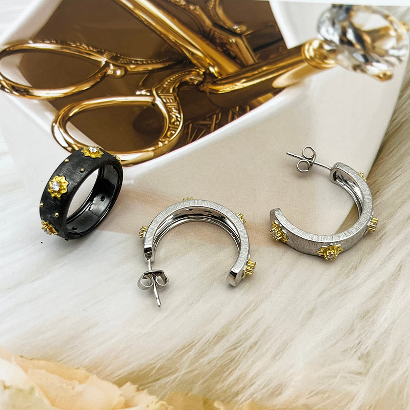 Craftsmanship: Hand-brushed finish + 3D relief engraving + Four-layer genuine gold plating This ring seamlessly blends the classic craftsmanship of Italian jewelry house Buccellati with modern black-gold aesthetics, perfect for those who seek individuality and quality. The understated yet luxurious black-gold color scheme exudes unique charm, whether worn daily or for special occasions.