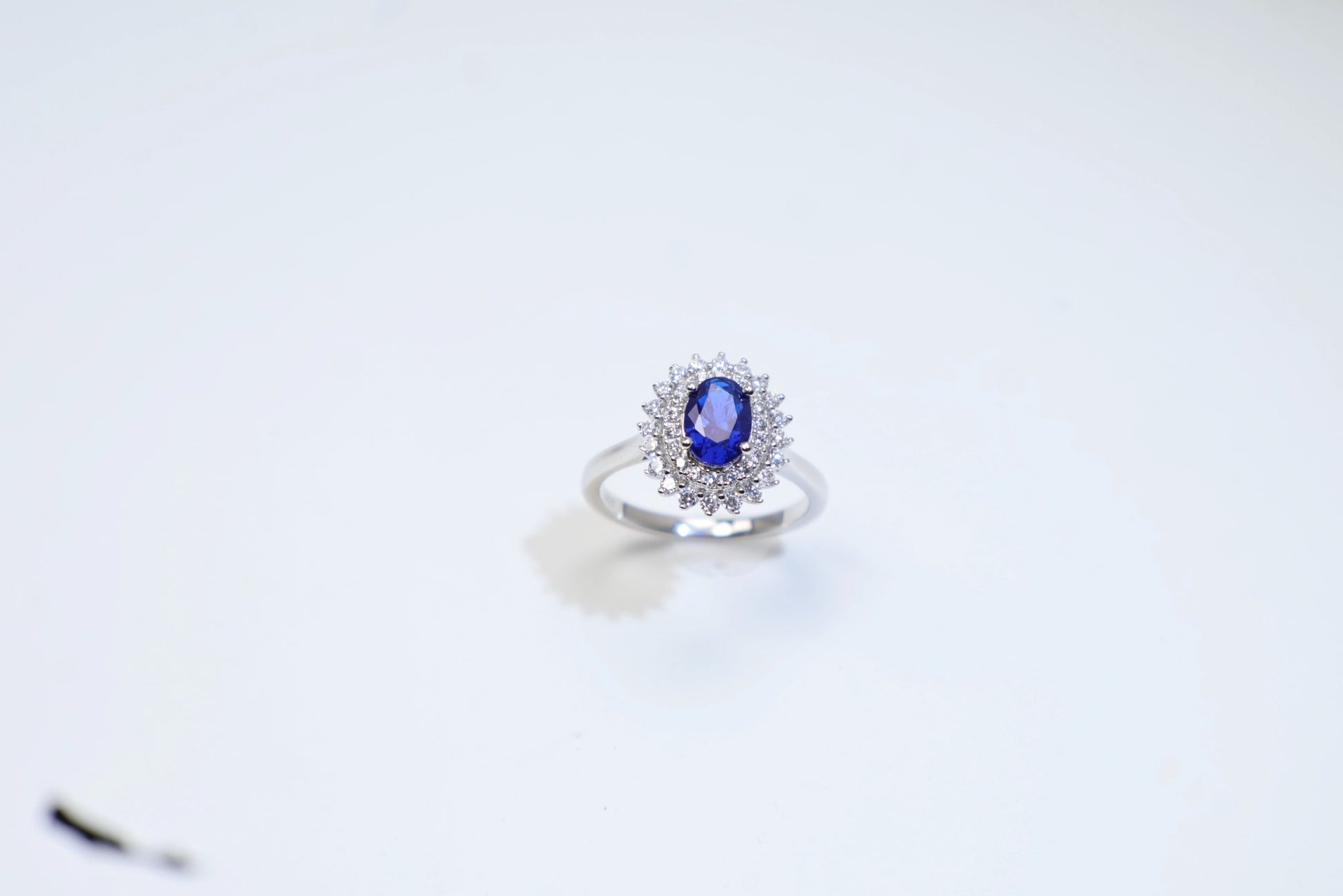 Oval Blue Spinel Halo Engagement Ring in White Gold Plated Silver
